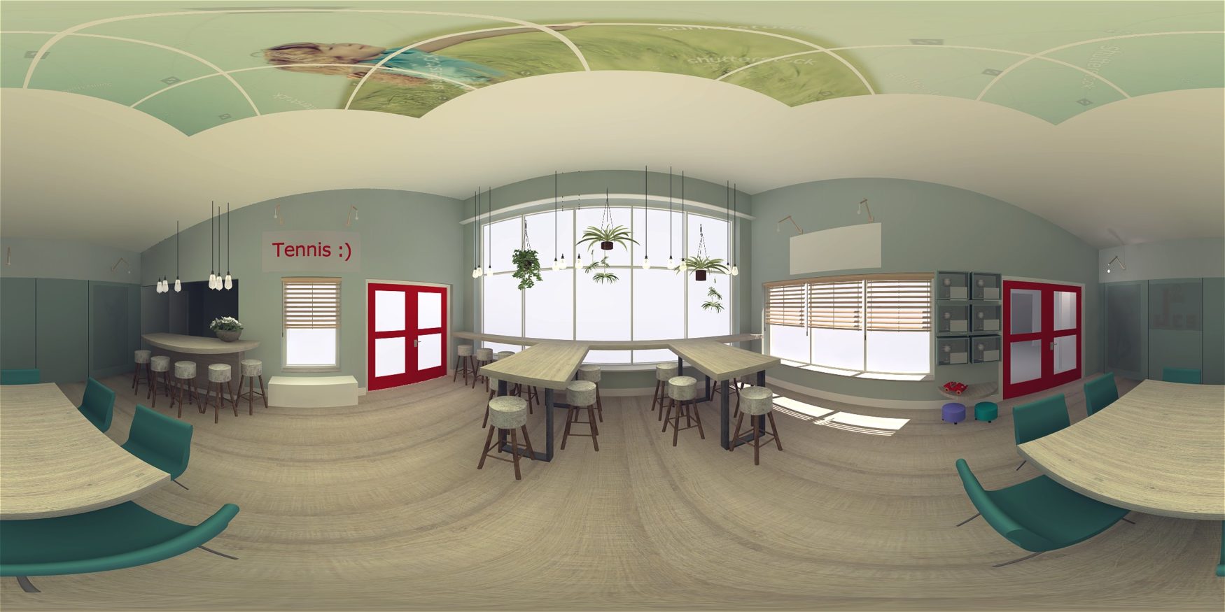 De muren krijgen een nieuwe groene tint. Daarmee trekken we het buitengebeuren naar binnen, de juiste sfeer voor een sportkantine in Venhorst. Door grote Visuals van de beide sporten op te hangen en de logo’s op de schuifwanden te schilderen wordt het duidelijk dat dit een kantine is van korfbalclub én tennisvereniging. De hoogte van de ramen benadrukken we door lange hanglampen en bloemenhangers voor de ramen op te hangen. De bar wordt uitnodigender gemaakt en voor de gehele buitenmuur wordt een groot barblad met flexibele losse bartafels geplaatst. Zo kunnen mensen binnen makkelijker contact maken met mensen buiten. Met de warme vloer en muurkleuren maakt de kantine een sfeervolle indruk.